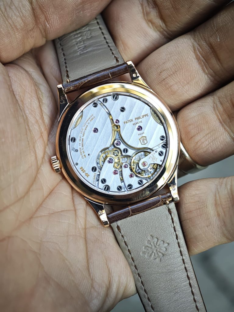 Detay: Safir kristal arka kapak sayesinde, Cenevre Mührü (Patek Philippe Seal) standartlarındaki üst düzey finisajı ve köprü işçiliğini izlemek mümkündür.